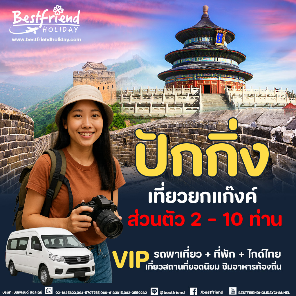 | ถึงท่าอากาศยานนานาชาติปักกิ่งต้าซิง ประเทศจีน นำท่านผ่านด่านพิธีการและศุลกากร(เวลาท้องถิ่นจีน เร็วกว่าไทย 1 ชั่วโมง กรุณาปรับนาฬิกาของท่าน เพื่อความสะดวกในการนัดหมาย) กรุงปักกิ่งเป็นเมืองหลวงของประเทศจีน เป็นศูนย์กลางทั้งด้านการปกครอง เศรษฐกิจ การคมนาคม และวัฒนธรรมของประเทศกรุงปักกิ่ง มีประวัติศาสตร์ยาวนานกว่า 3,000 ปี เป็นเมืองหลวงโบราณของจีน ตั้งแต่สมัยราชวงศ์เหลียว จิน หยวน หมิง และชิง รวม 5 ราชวงศ์ และเมื่อสถาปนาสาธารณรัฐประชาชนจีนในปี 2492 (ค.ศ. 1949) รัฐบาลพรรคคอมมิวนิสม์จีนก็ได้เลือกปักกิ่งให้เป็นเมืองหลวงของประเทศ | |
